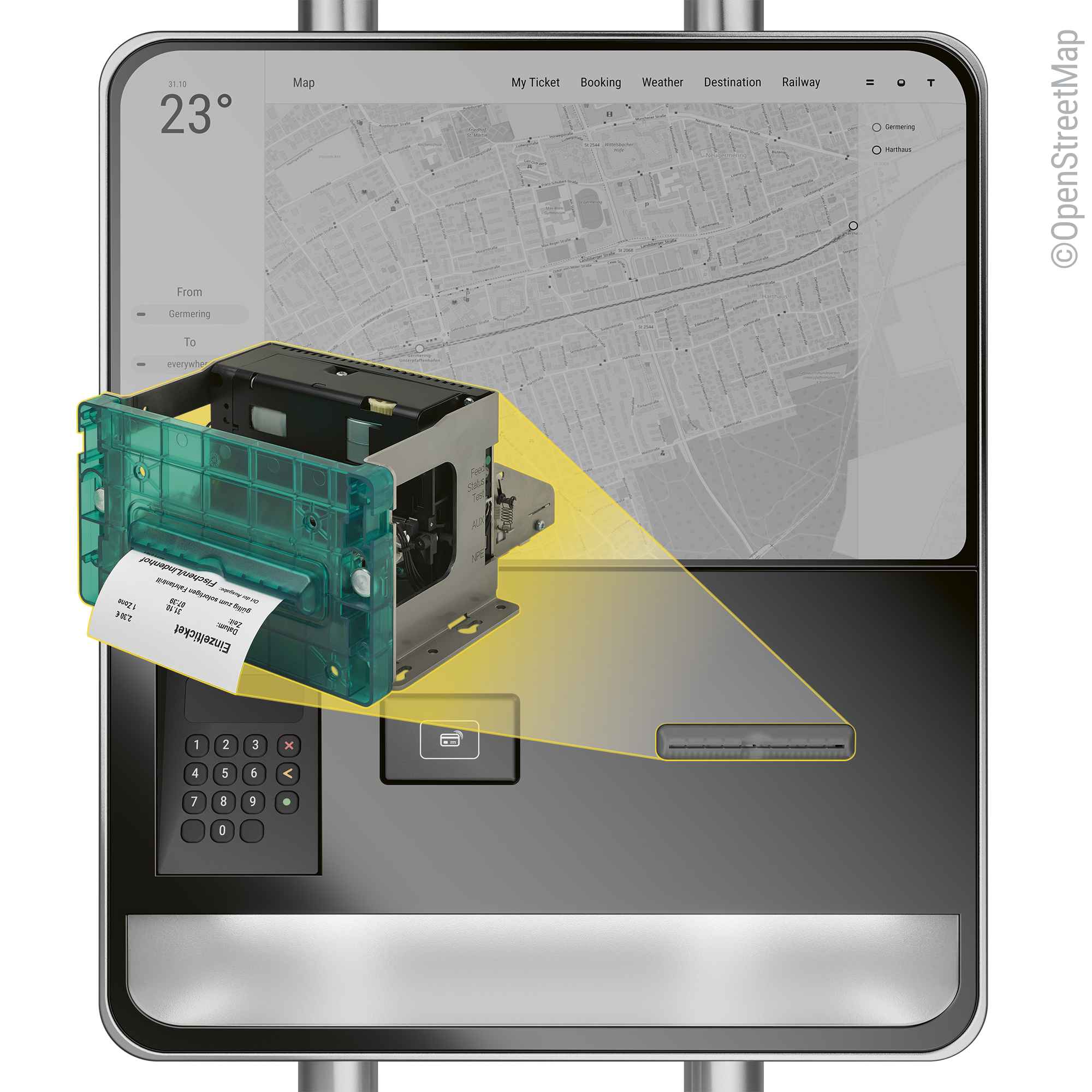 | Dank des frei wählbaren Papierformats zwischen 63 und 86 mm Breite bringt der Thermodrucker eine hohe Einsatzflexibilität mit. Alles in allem erweist er sich als so raumsparend, dass oft sogar noch ein zweites Gerät mitsamt Papierrolle im Automateninneren Platz findet. Das bringt große Vorteile im Alltagsbetrieb: Die Verfügbarkeit erhöht sich signifikant, während die Servicekosten spürbar sinken. | |